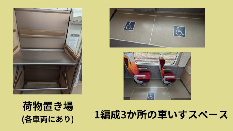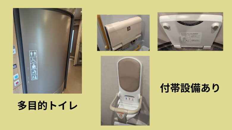 多目的トイレの中には、折りたたみ式のベビーベット、着替え台、ベビーキープなどもあります。多目的トイレ付近には大きな姿見や男性用トイレがあります。その他、一部車両に洋式トイレがあります。