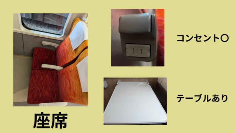 最新の新幹線(N-700S)の座席を参考にしています。リクライニング機能があります。Wi-Fi(少し遅め)もあります。