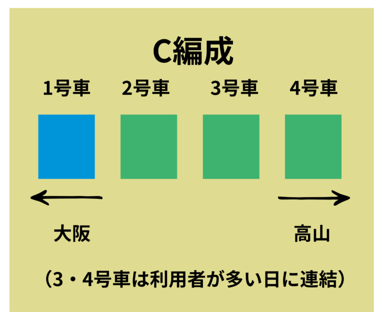 富山または大阪へ直通する列車(10往復のうち5往復)が該当します。定期列車は、A編成+B編成またはC編成で運転されます。