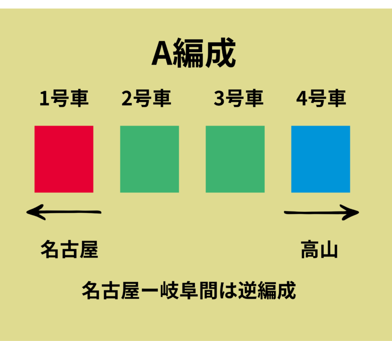 名古屋―高山間はA編成と一緒に運転。この場合、A編成の増結はありません。車いすスペースは指定席です。