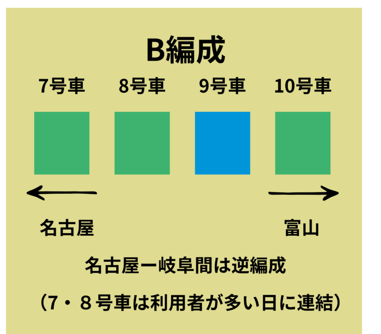 岐阜―高山間はA編成と一緒に運転。この場合のA編成は5~8号車として運転。利用者が多い日は9・10号車を増結する場合があります。車いすスペースは指定席です。